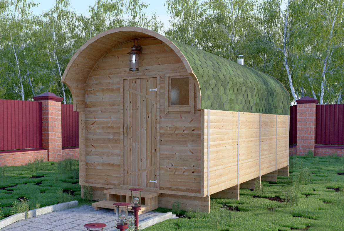 Одним из самых популярных вариантов предлагаемых конструкций модульных бань являются бани-бочки буханки. Свое название они получили благодаря тому, что их форма визуально напоминает буханку формованного хлеба, а именно, прямоугольный корпус с полукруглой кровлей. Эта концепция обеспечивает эффективное использование занимаемого пространства, обеспечивает стильный дизайн объекта.