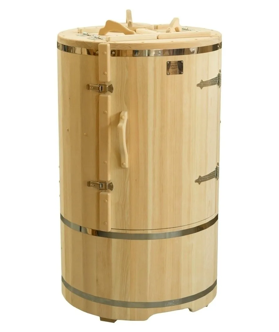 Кедровая бочка (фитобочка) круглая «Классическая» Круглая фитобочка из кедра - это мини парная, которую можно использовать не только в спа-салонах, но и дома. Такая модель наиболее компактна и мобильна. Толщина стенок составляет 25 мм. Фитобочка оборудована откидными створками, дверцей и отверстием для головы. Во время парения человек сидит внутри кедровой бочки, а голова находится снаружи. Благодаря этому исключается возможность перегрева. Подлокотники из кедра, встроенные ручки на створках и двери делают эксплуатацию более удобной. Парение в фитобочке благотворно влияет на организм в целом: повышается иммунитет, выводятся шлаки и токсины, улучшается работа органов тела и состояние кожи.