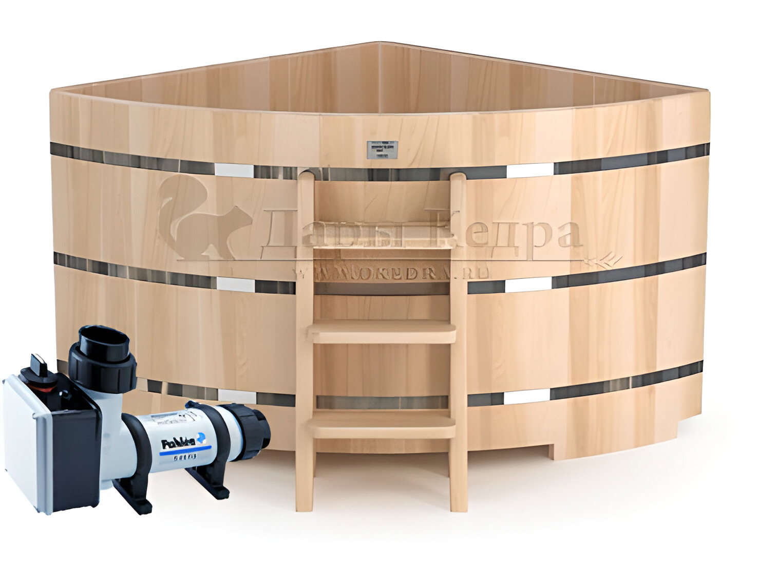 • Купель угловая (Фурако) из кедра с внешним электроподогревом Угловая купель с внешним электроподогревом изготавливается из дерева, наиболее популярными и ценными являются купели из алтайского кедра, который отличается экологичностью и положительным воздействием на человека. Необходимо помнить, что электроподогрев служит для поддержания необходимой температуры воды, налитой в купель, а не для ее нагрева! Новинка! , новая технология термокрышек позволит защитить купель от условий неблагоприятной среды, а также сохранит необходимую температуру воды на долгое время.
