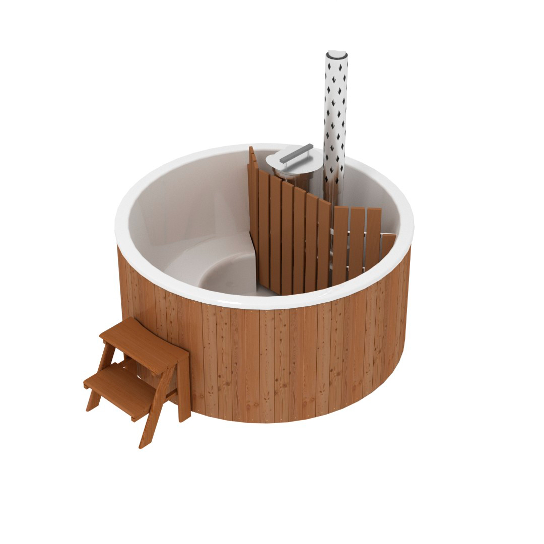 Финская круглая композитная купель с подогревом (с печкой) «Премиум 160 хот с печью 25 квт» Это уличная подогреваемая купель с круглой внутренней чашей, которая изготовлена из современного прочного и термоустойчивого материала (композита). Форма чаши обеспечивает комфортную посадку во время принятия процедур. Для удобства пользования купель оборудована приставной лестницей. Подогрев воды осуществляется внешней печью с дымоходом. Композитная вставка придает купели красивый внешний вид, продлевает срок службы и облегчает уход за изделием. Парение на свежем воздухе – это отличный способ укрепить здоровье и поддержать организм в тонусе.