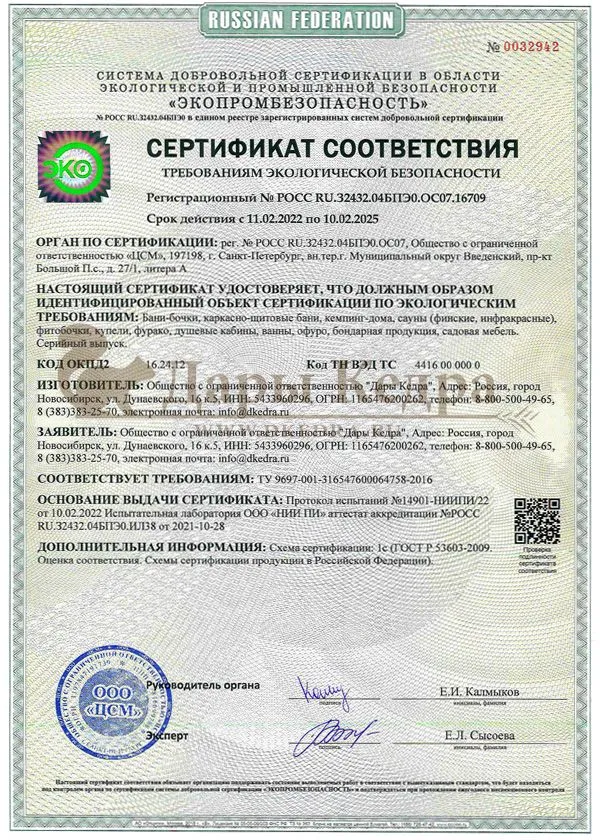 Кедр по наличию сучков делится на сорт: 0 (экстра) - не имеет сучков вообще, 1 - минимальное их количество, 2-3 сорт без ограничения по количеству сучков. Наша производственная компания хорошо изучила свойства древесины кедра, исходя из этого применяем определённый сорт для каждого типа изделий: ИК-сауны, купели, фурако делаем из кедра сорта 0-2, фитобочки - из сорта 1-2. Для фитобочек сучки необходимы, так как именно в них содержатся фитонциды. Для бань-бочек применяем 1-3 сорт, полки и лавки из 0-2 сорта. Не поддаётся гниению, так как является природным антисептиком и древесина очень пластичная, не растрескивается, любит влагу. Именно поэтому мы работаем с кедром, ценим его и рады дарить людям здоровье!