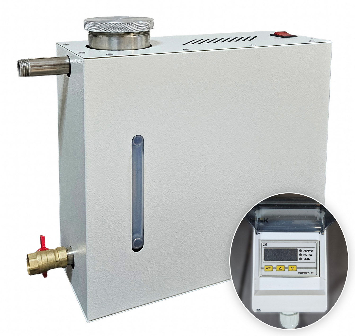 • Парогенератор проточный, от 4 до 8 кВт Проточные парогенераторы подключаются к водопроводу и автоматически добавляют воду в прибор при ее расходовании. Парогенератор служит для образования пара в саунах, хамамах, банях и душевых кабинах. Мощность стоит выбирать в зависимости от объема парной. При достижении необходимой температуры, происходит автоматическое прекращение подачи тепла для нагрева воды. При снижении температуры более чем на 3°С, температурный датчик снова включает подогрев. Таким образом время непрерывной работы парогенератора составляет более 12 часов.