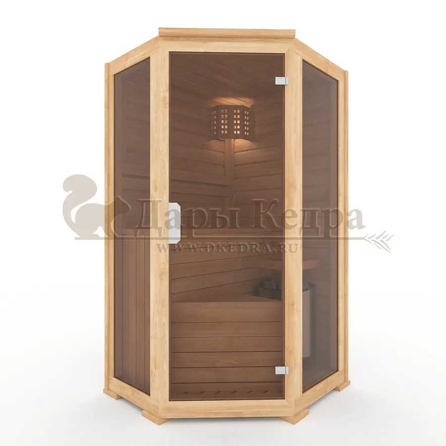 Одноместная угловая финская сауна кабина из кедра с электрокаменкой Это специально оборудованная деревянная кабина для сухого и влажного парения. Электропечь нагревает пространство внутри и позволяет сбрызгивать камни водой, слегка увлажняя воздух. Такая процедура позволяет избежать перегрева. Двойные стенки кабины с теплоизоляционным материалом удерживают тепло. Установка сауны в угол позволяет рационально использовать пространство помещения. Финская сауна с электропечью подойдет как для домашнего использования, так и для коммерции. Доставляется в разборном виде щитами, собирается по инструкции с помощью шуруповёрта. Обращаем Ваше внимание, что в стоимость сауны уже включена дверь с закаленным стеклом в раме из кедра с фиксатором и деревянным фасадом. Вы можете заменить фасад на цельностеклянный с безрамной дверью за дополнительную плату. Нагреваясь, древесина кедра выделяет полезные вещества-фитонциды, которые благотворно влияют на организм в целом и укрепляют иммунитет.