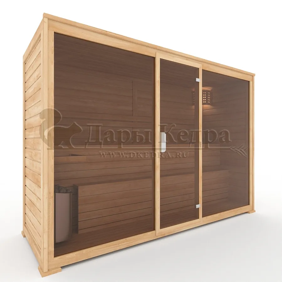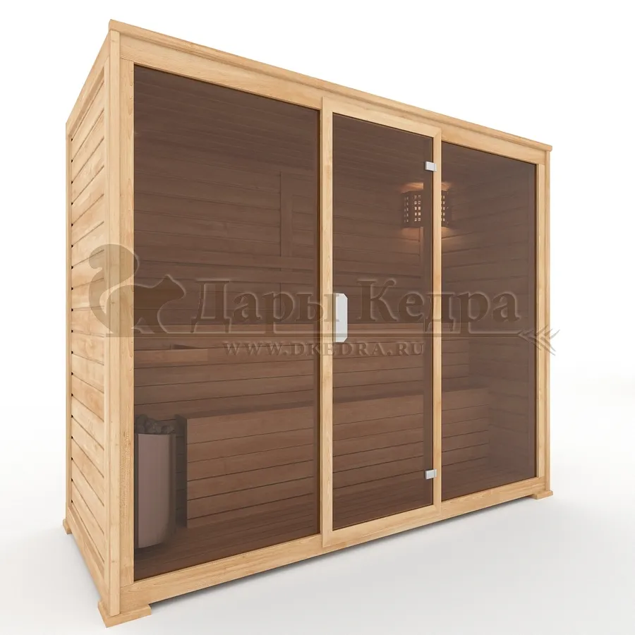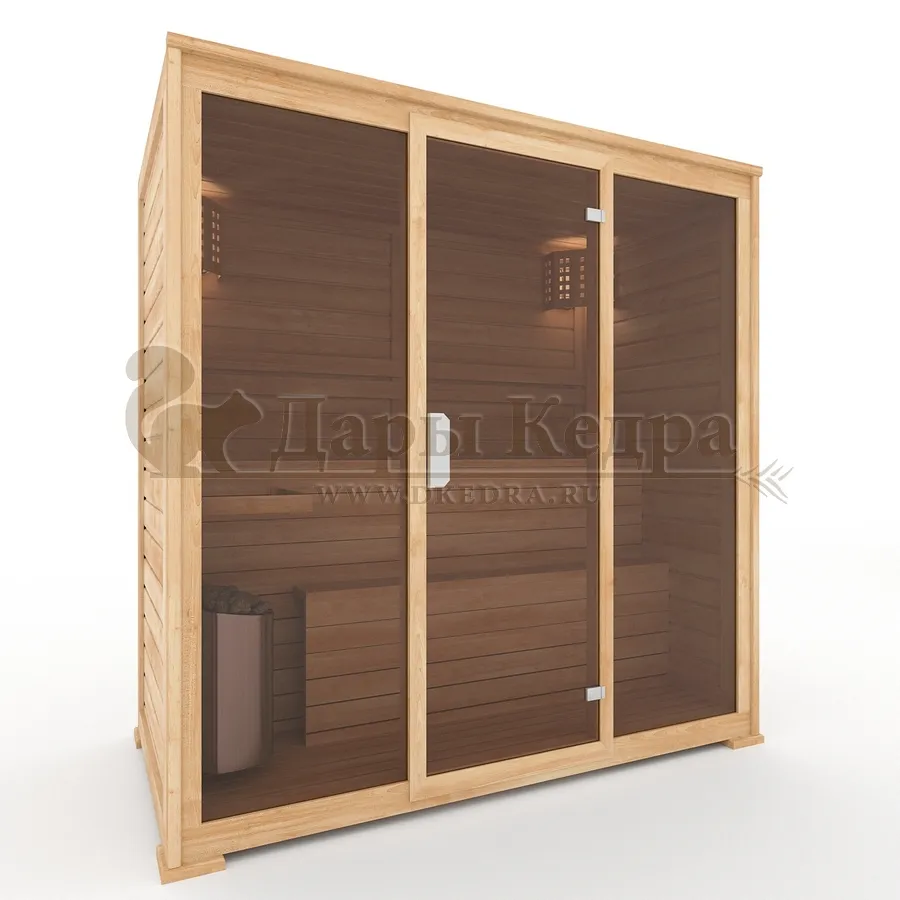 Трехместная финская сауна кабина из кедра с электрокаменкой Это специально оборудованная готовая деревянная кабина для сухого и влажного парения. Электропечь нагревает пространство внутри и позволяет сбрызгивать камни водой, слегка увлажняя воздух. Такая процедура позволяет избежать перегрева. Сауна обшита снаружи и внутри кедровой вагонкой и имеет теплоизоляционный слой. Финская сауна с электропечью подойдет, как для домашнего использования, так и для коммерции. Доставляется в разборном виде щитами, собирается по инструкции с помощью шуруповёрта. Обращаем Ваше внимание, что в стоимость сауны уже включена дверь с закаленным стеклом в раме из кедра с фиксатором и деревянным фасадом справа. Вы можете заменить фасад на цельностеклянный с безрамной дверью за дополнительную плату. Нагреваясь, древесина кедра выделяет полезные вещества-фитонциды, которые благотворно влияют на организм в целом и укрепляют иммунитет.