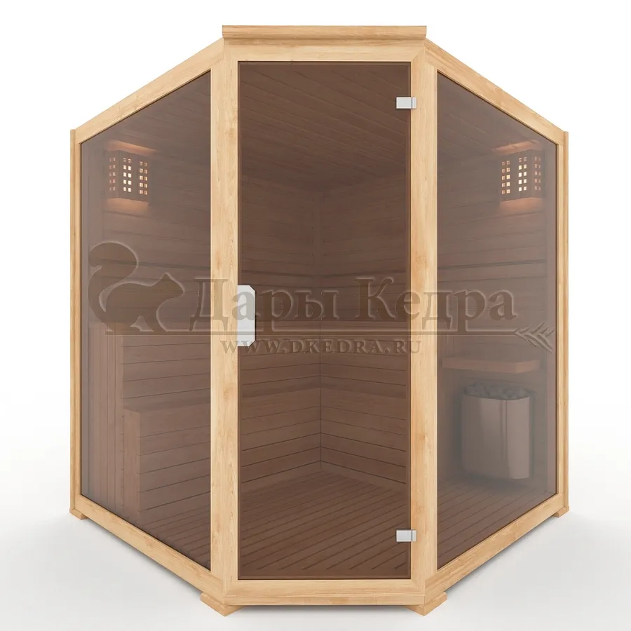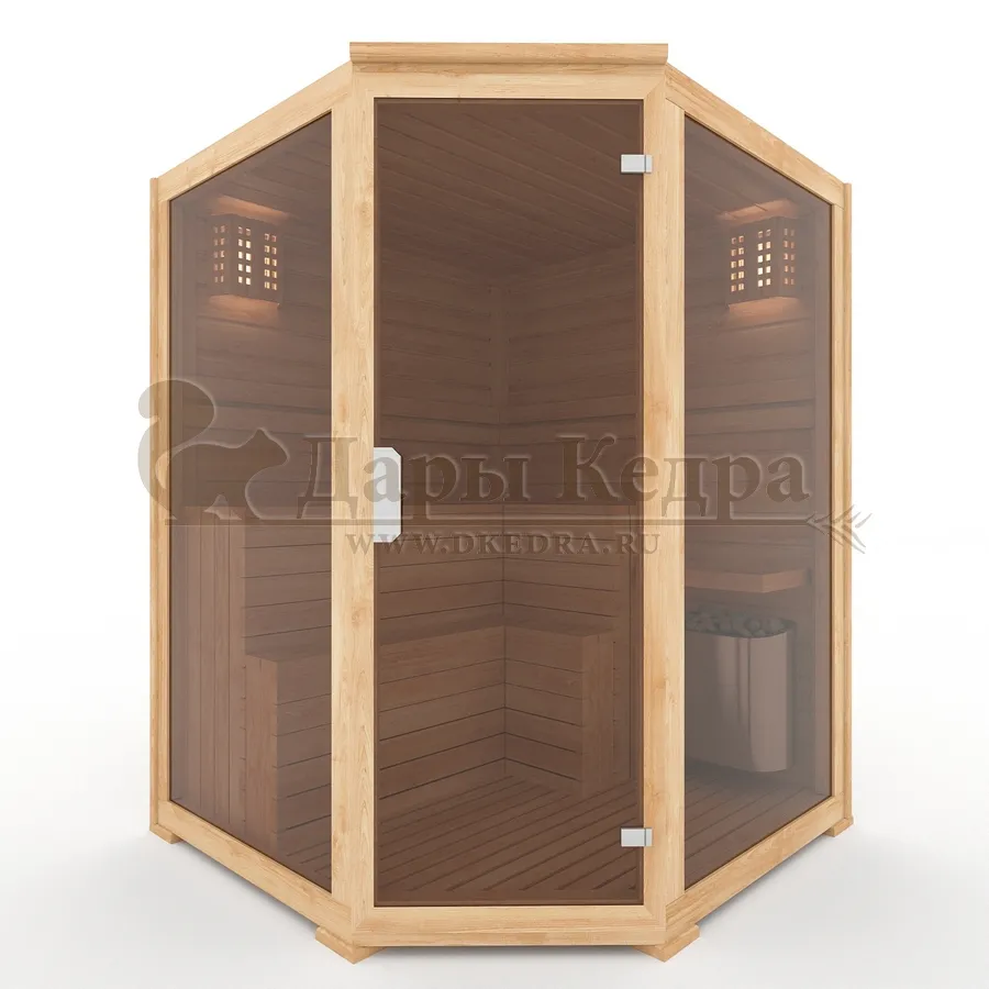 Трехместная угловая финская сауна кабина из кедра с электрокаменкой Это специально оборудованная деревянная кабина для сухого и влажного парения. Электропечь нагревает пространство внутри и позволяет сбрызгивать камни водой, слегка увлажняя воздух. Такая процедура позволяет избежать перегрева. Двойные стенки кабины с теплоизоляционным материалом удерживают тепло. Установка сауны в угол позволяет рационально использовать пространство помещения. Финская сауна с электропечью подойдет как для домашнего использования, так и для коммерции. Доставляется в разборном виде щитами, собирается по инструкции с помощью шуруповёрта. Обращаем Ваше внимание, что в стоимость сауны уже включена дверь с закаленным стеклом в раме из кедра с фиксатором и деревянным фасадом справа. Вы можете заменить фасад на цельностеклянный с безрамной дверью за дополнительную плату. Нагреваясь, древесина кедра выделяет полезные вещества-фитонциды, которые благотворно влияют на организм в целом и укрепляют иммунитет.